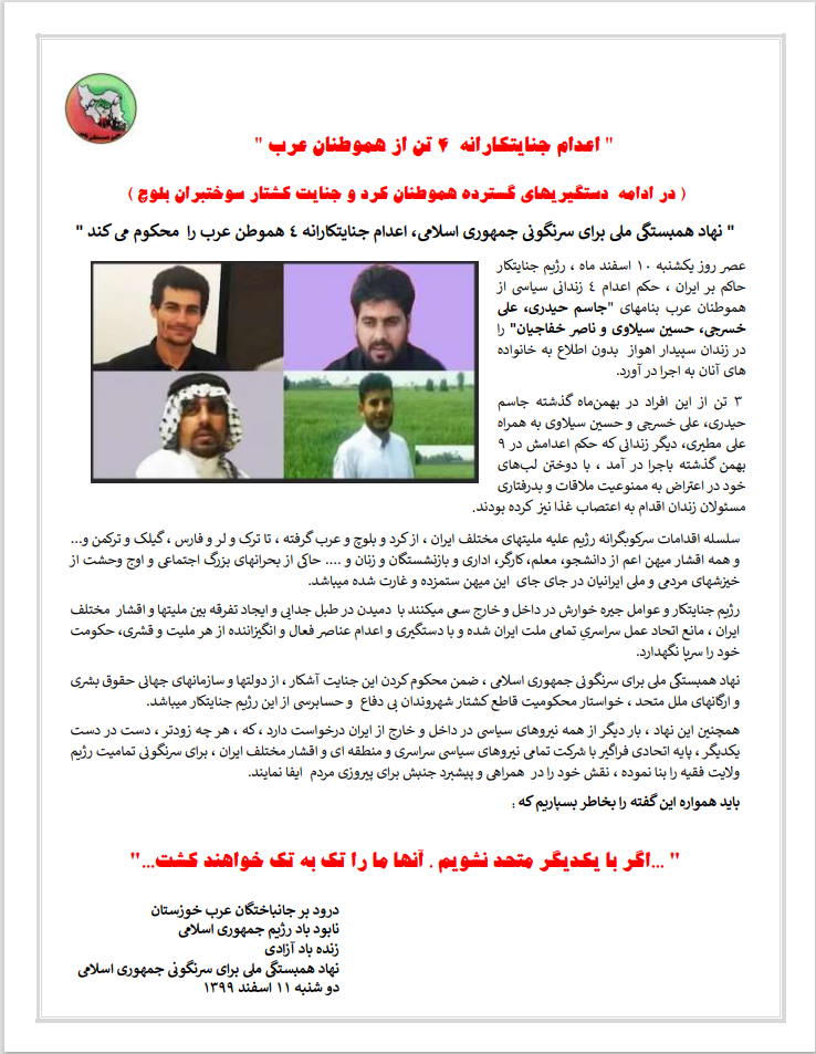 ” نهاد همبستگی ملی برای سرنگونی جمهوری اسلامی، اعدام جنایتکارانه ۴ هموطن عرب را محکوم می کند “